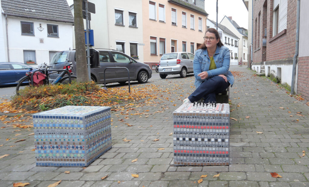 Bei der offiziellen Übergabe erklärte Projektbetreuerin Barbara Henschke noch einmal die Entstehung der bunten Mosaikbilder, die von den Teilnehmenden zunächst in der Kreativwerkstatt „Kunterbude“ in der Mühlenbachstraße gemeinsam entwickelt wurden, bevor sie an Ort und Stelle geklebt und anschließend verfugt wurden. So entstand auf einem der Quader auch ein Schachbrett aus Mosaiksteinen, das fürs Spielen im Freien genutzt werden kann. Das Bürgerforum will im Frühjahr dafür sorgen, dass sich schachbegeisterte Sinziger in der Nähe gegen Pfand ein Schachspiel plus zwei Klappsitze ausleihen können, um diese Spielgelegenheit zu nutzen.
